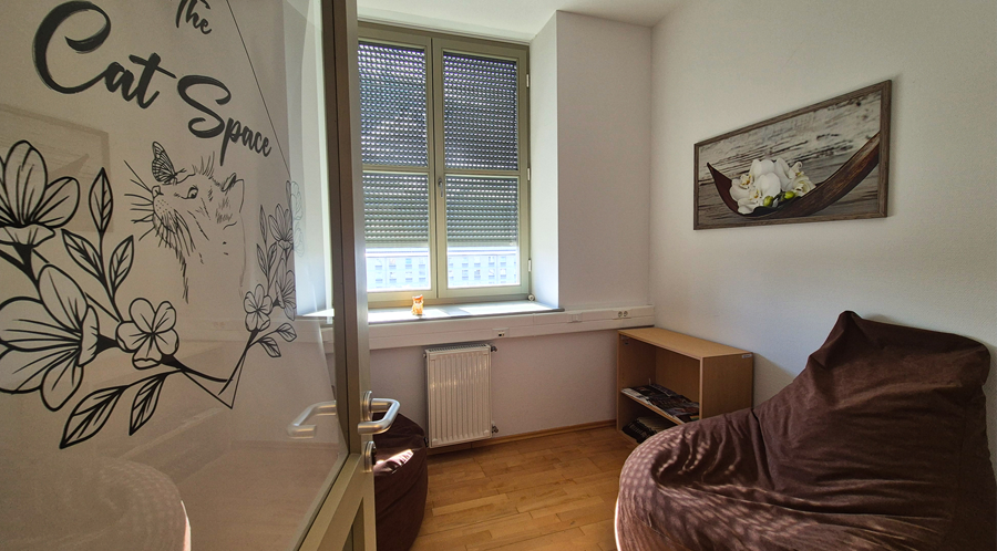 A macskás szobák az elmélyült egyéni olvasásra, lazításra vagy beadandó feladatok közös elkészítésére, csoportmunkára egyaránt alkalmas tereket biztosítanak.