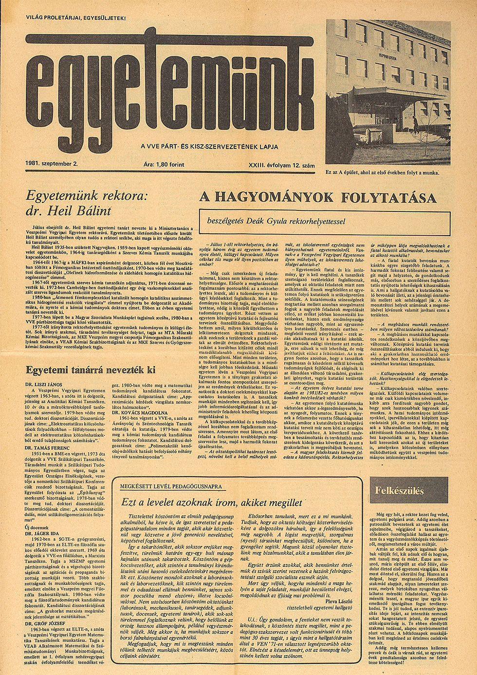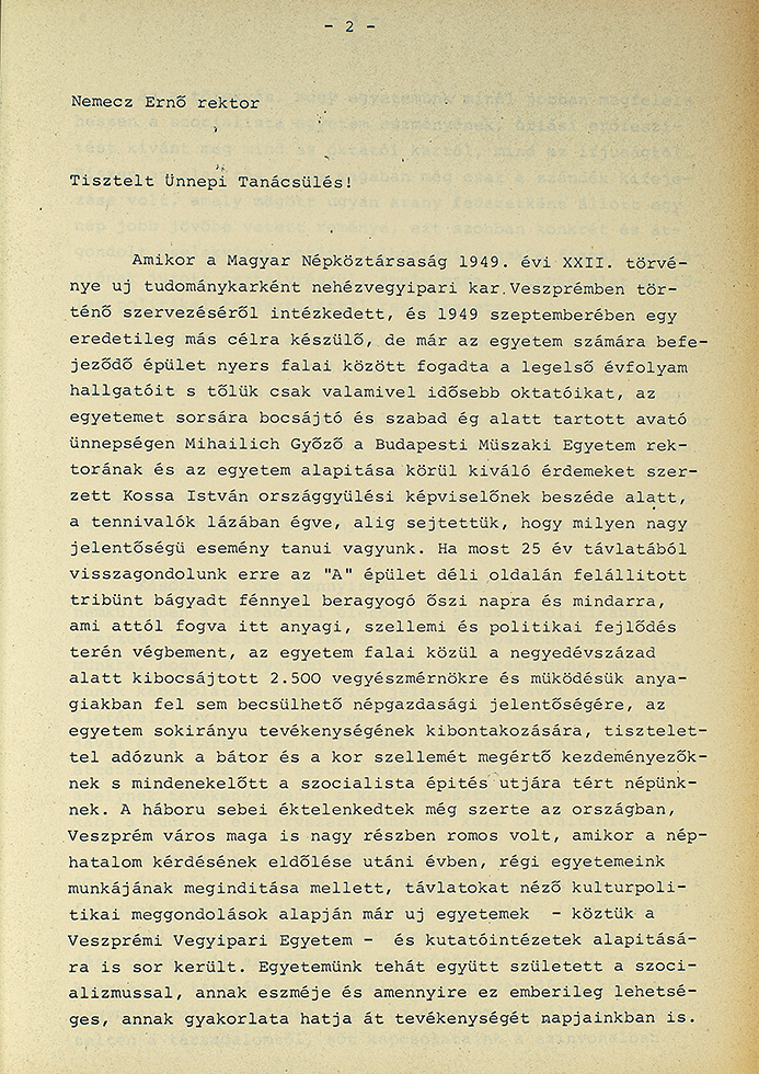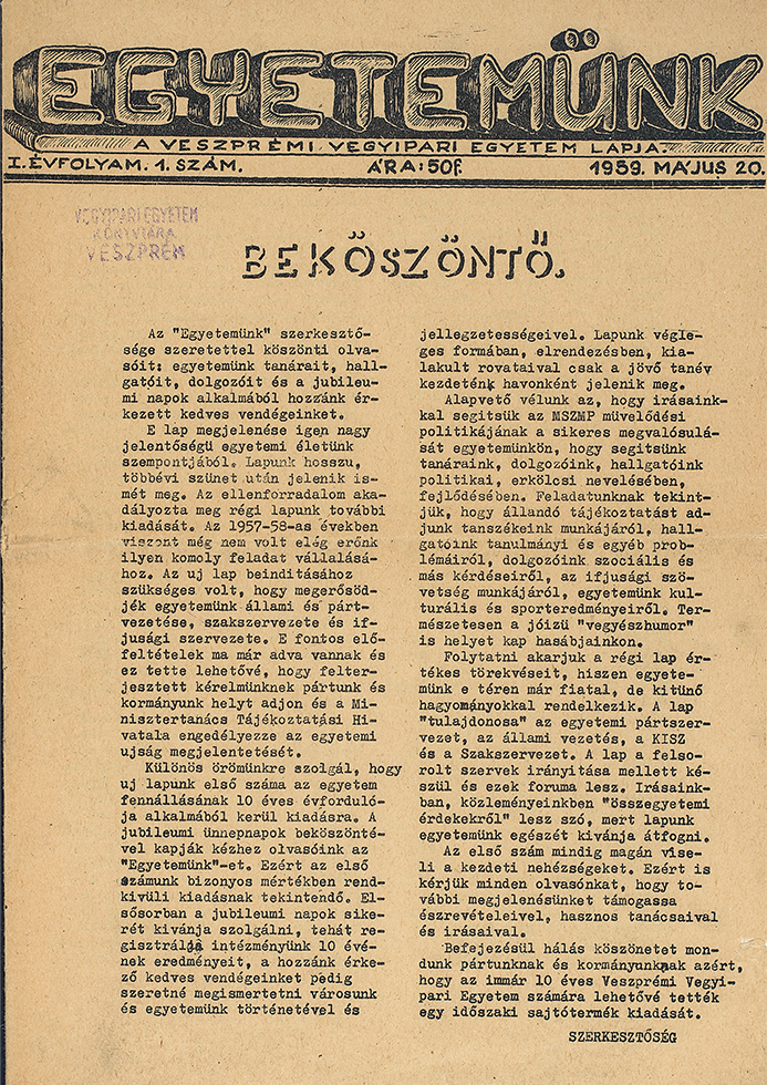 A Budapesti Műszaki Egyetem veszprémi Nehézvegyipari Karának alapítása 1949-ben jelentős mérföldkő volt Magyarország műszaki felsőoktatásában. A díszes avató ünnepségre október 16-án került sor. Az intézmény azzal a céllal jött létre, hogy a vegyipar számára magasan képzett szakembereket képezzen, és innovatív megoldásokkal támogassa az ipar fejlődését. Az Egyetem 1951-től Veszprémi Vegyipari Egyetem néven önálló intézményként folytatta tovább tevékenységét. Azóta hírneve folyamatosan erősödött, és ma is elkötelezett a tudományos kutatás, az ipari együttműködés és a hallgatói kiválóság mellett.