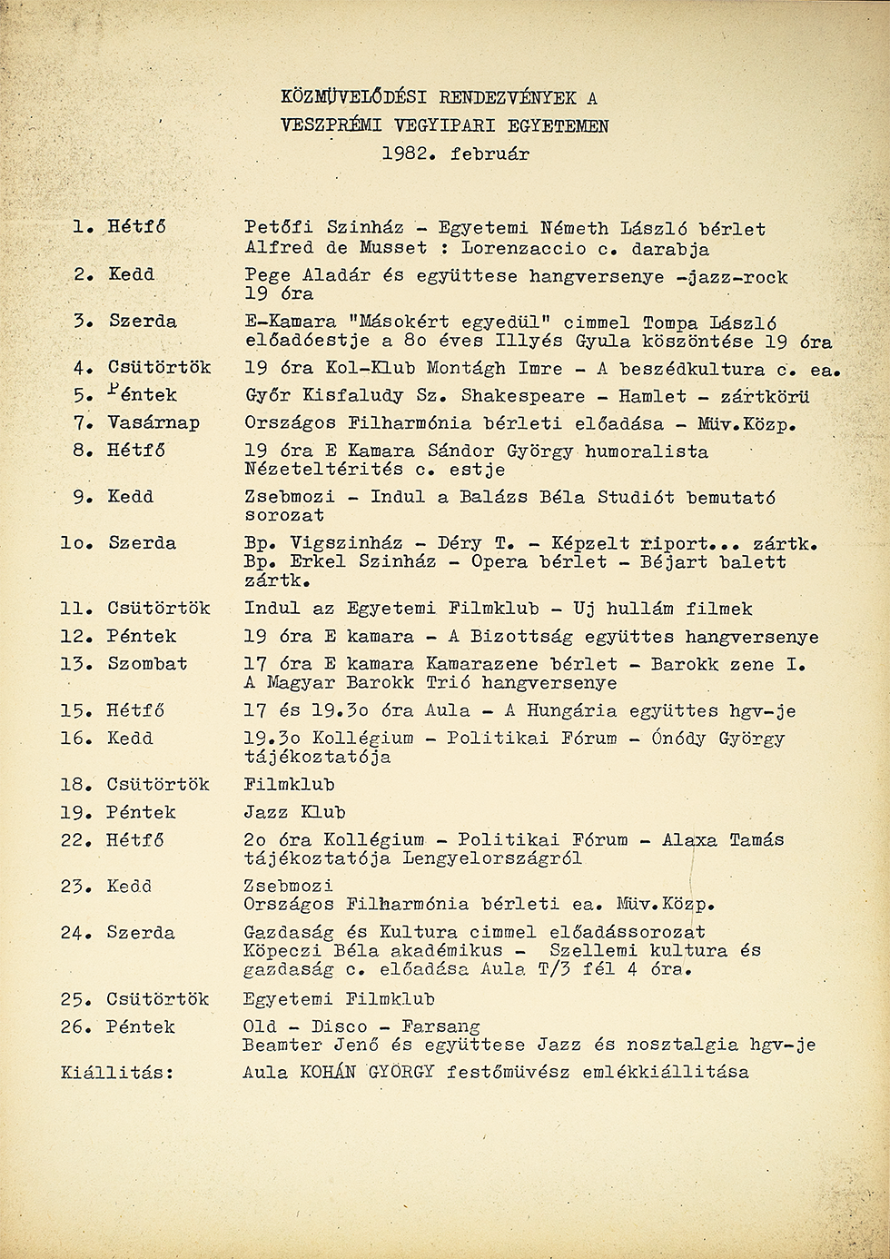 A tárlat anyagát az elmúlt évtizedekben az Egyetemen történt jeles események, emlékezetes programok, kiemelkedő személyiségek, neves tudósok emlékét őrző levéltári iratokból és fotógyűjteményből állítottuk össze. A teljesség igénye nélkül villantjuk fel intézményünk történetének mérföldköveit, az itt zajló oktatási és kutatási tevékenység, valamint a diákélet, a kulturális és sportesemények egy-egy pillanatát a Levéltárban őrzött, maradandó értékű dokumentumok segítségével.