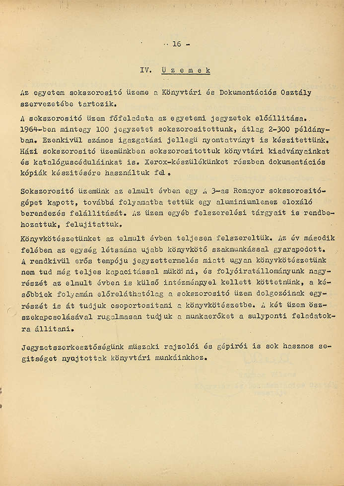 Az Egyetemi Nyomda megalakulása az 1964-es évhez köthető, amikor az Egyetem sokszorosító műhelye önálló könyvkötészettel gyarapodott. Ettől fogva számos kiadvány és jegyzet készült, - a nyomda emellett külső megbízásokat is teljesített. A kiállított tárgyak között a nyomdai munka során használt néhány eszköz is megtalálható, mint például a klisék, amelyek a képek sokszorosítására használt fémlemezek.